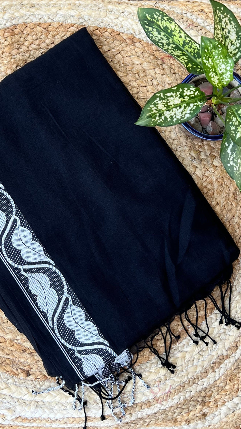 Black Handloom cotton saree with white motif border