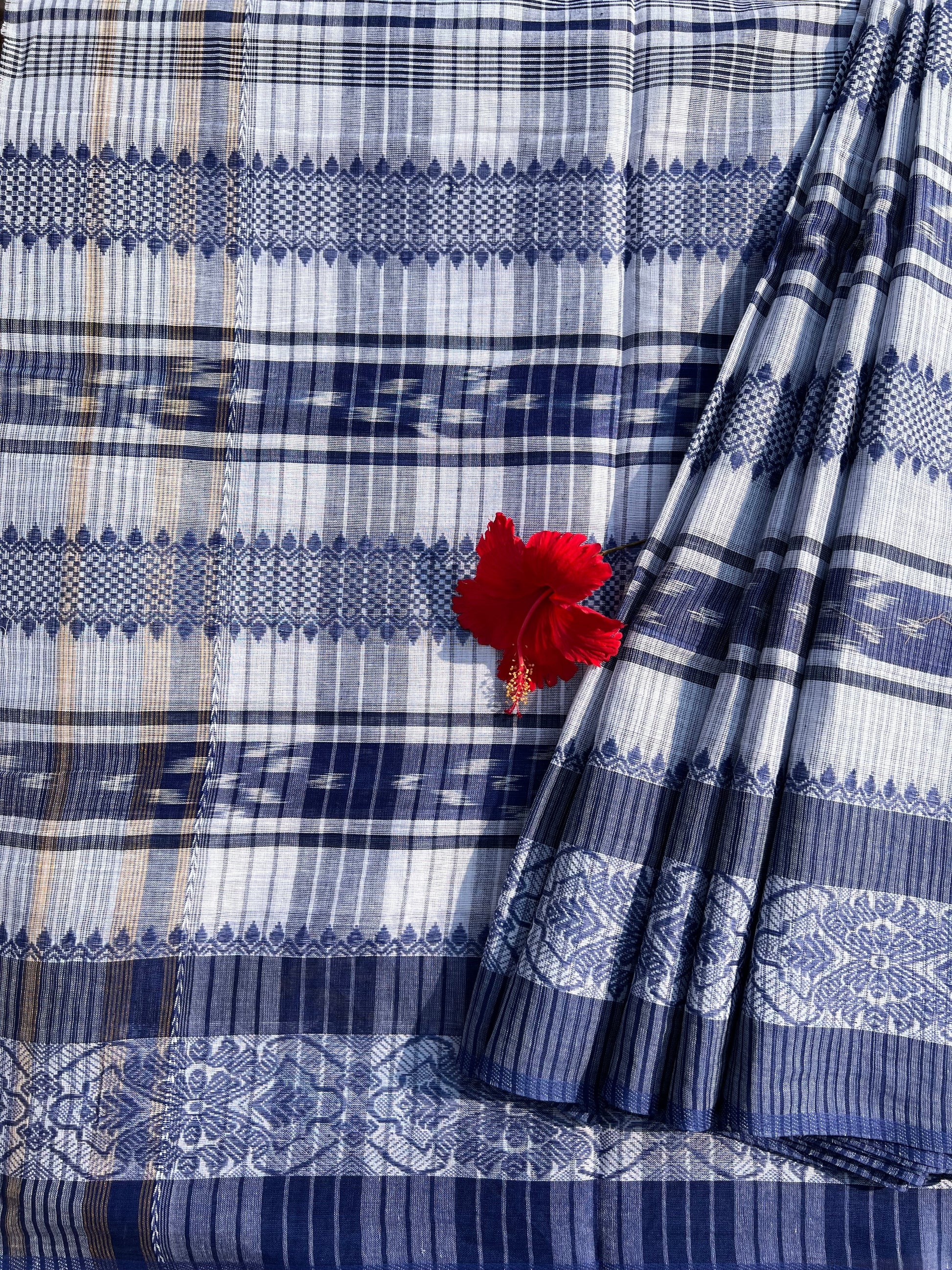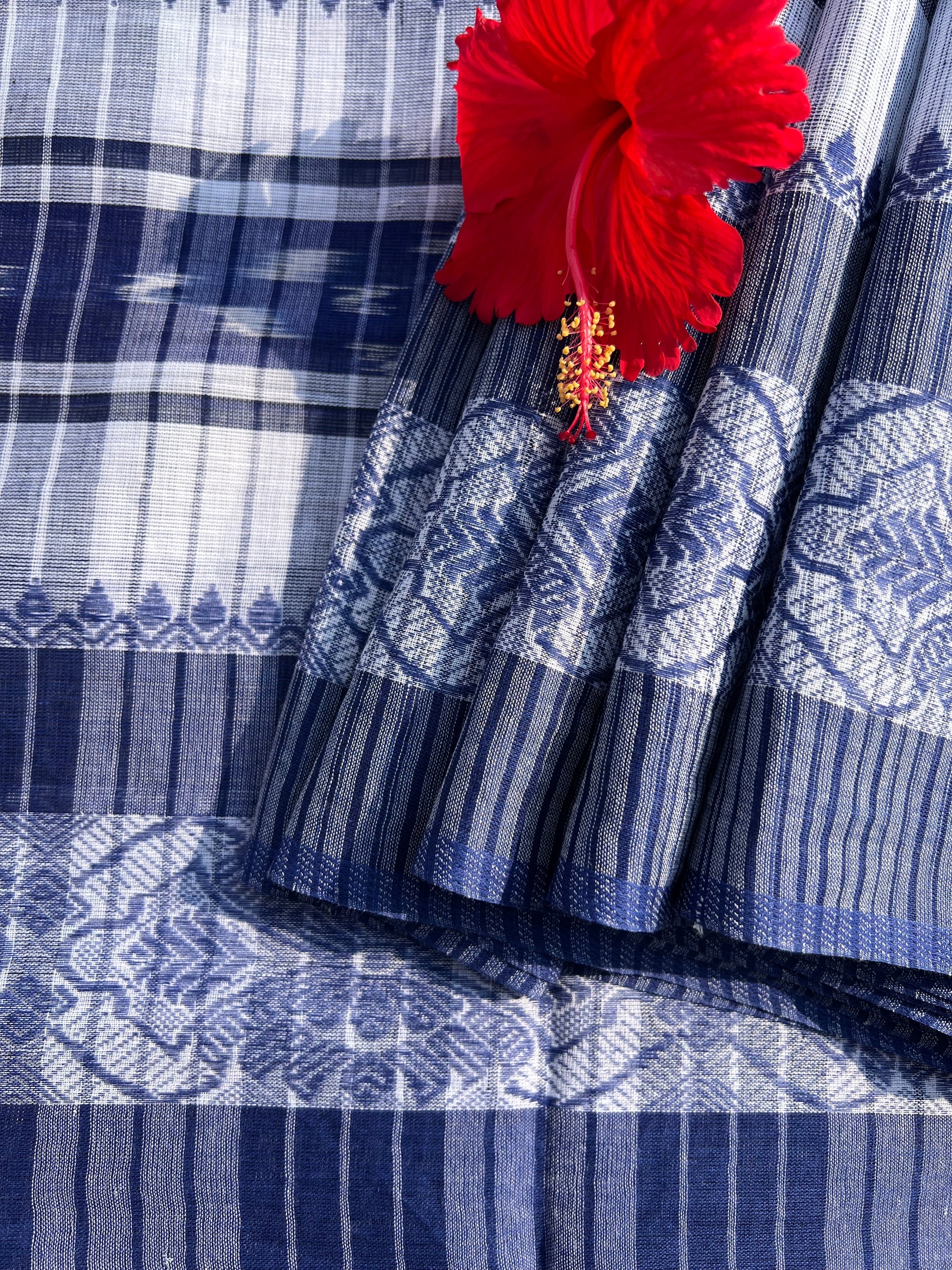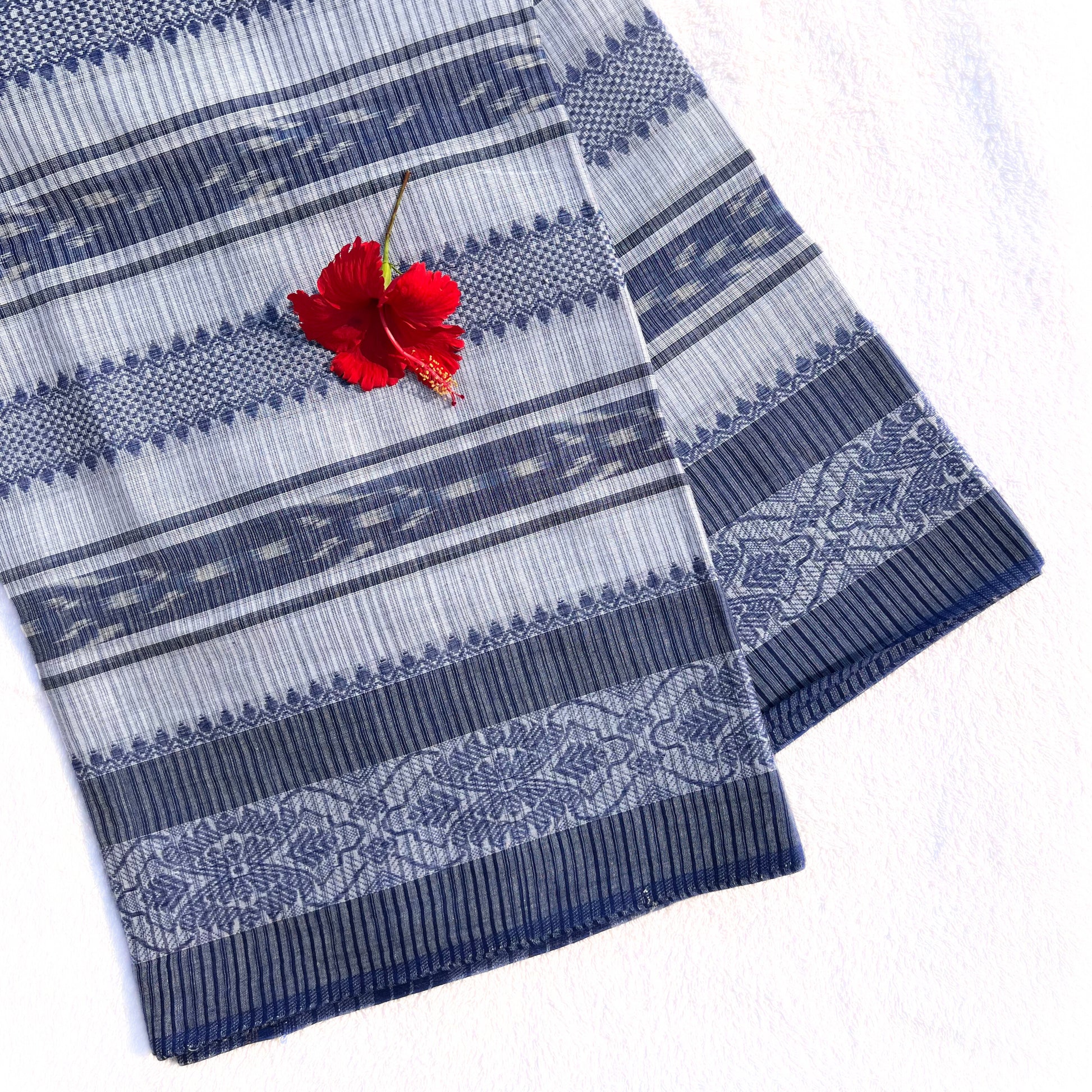 A classic from Bengal, this Dhaniakhali handloom saree features alternate stripes in two designs, woven in deep indigo and white. The signature checkered base and a richly patterned palla, makes it perfect for everyday elegance or cultural gatherings. Light, breathable, and full of heritage.