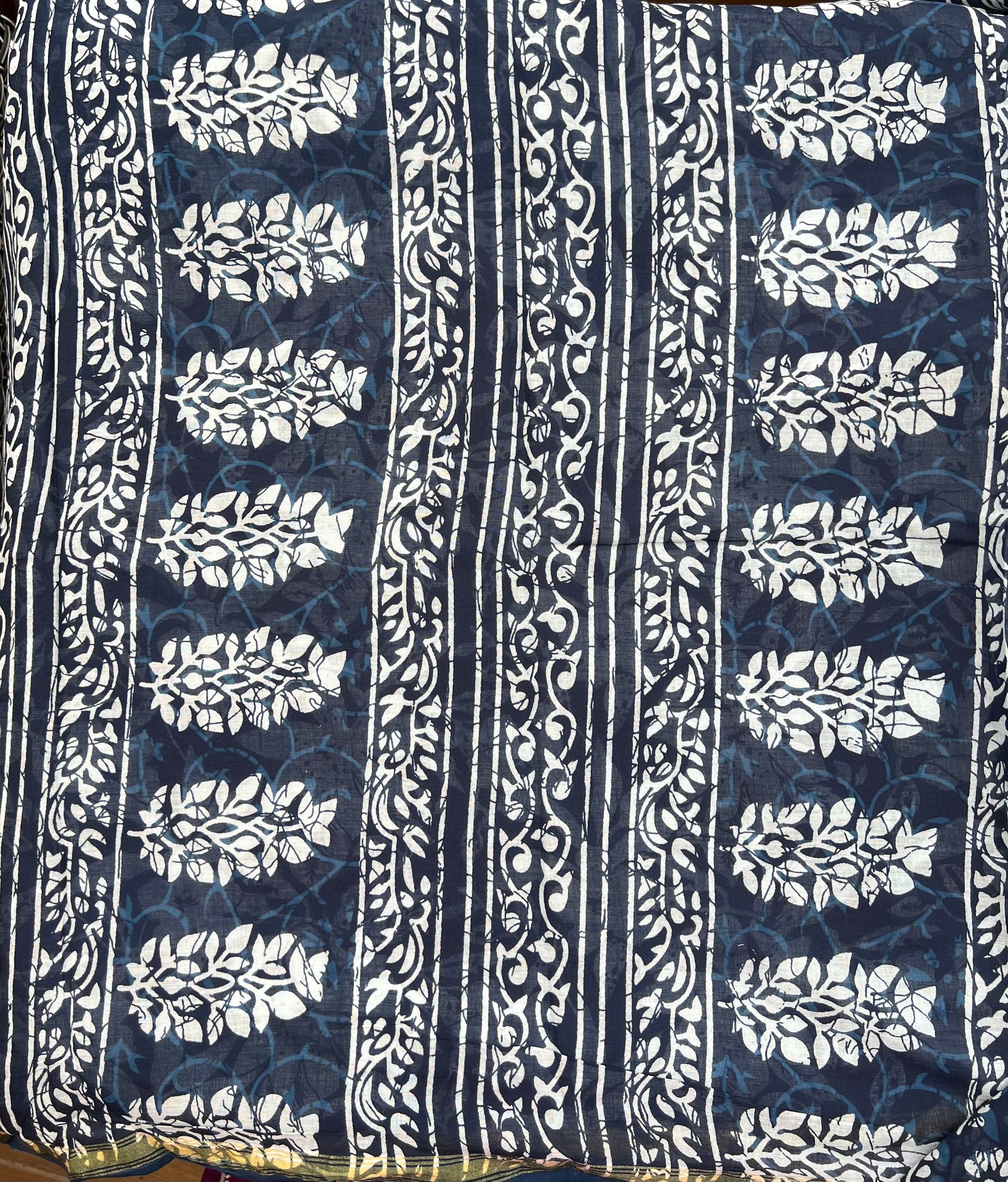 Elevate your everyday elegance with this printed indigo cotton saree, featuring a minimal zari border and small motifs. Lightweight and breathable, it’s perfect for workwear or casual outings. The simple border adds a touch of tradition to its minimal charm.
