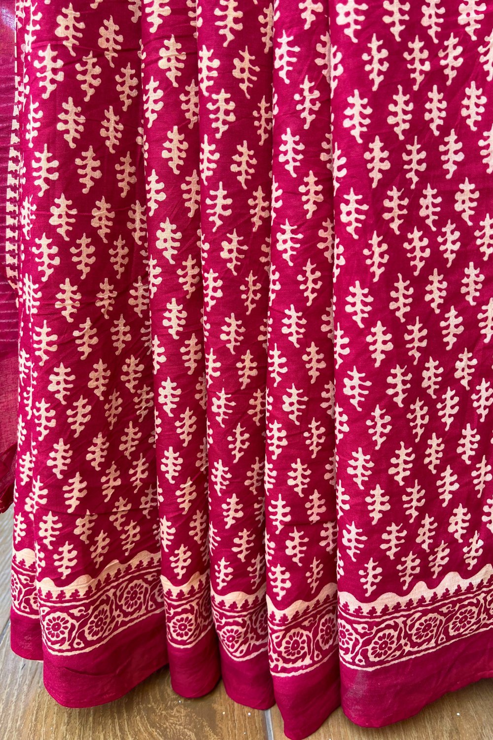 Elevate your everyday elegance with this Maheshwari-printed maroon cotton saree, featuring intricate off-white floral and leaf motifs. Lightweight and breathable, it’s perfect for workwear or casual outings. The bold border adds a touch of tradition to its minimal charm.