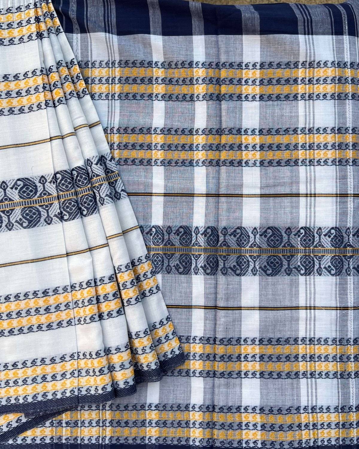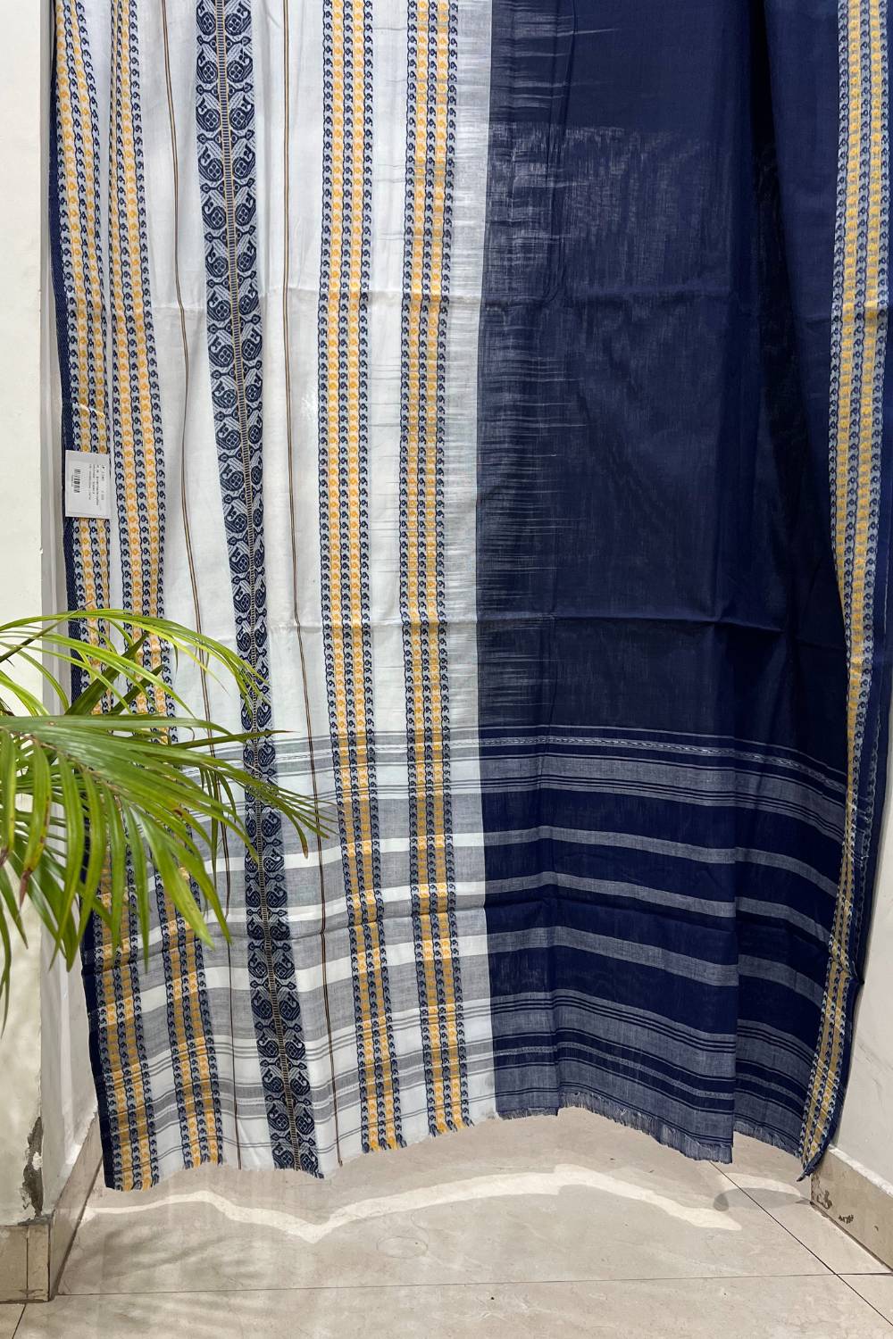 Introducing your new favorite go-to saree—a Dhaniakhali handloom beauty that's part navy blue sophistication, part crisp white striped charm. Woven with traditional flair, this soft, comfortable drape is the ultimate shapeshifter: dress it up for the office, dial it down for weekend plans, and watch it work magic every single time. Smart, stylish, and wonderfully wearable.