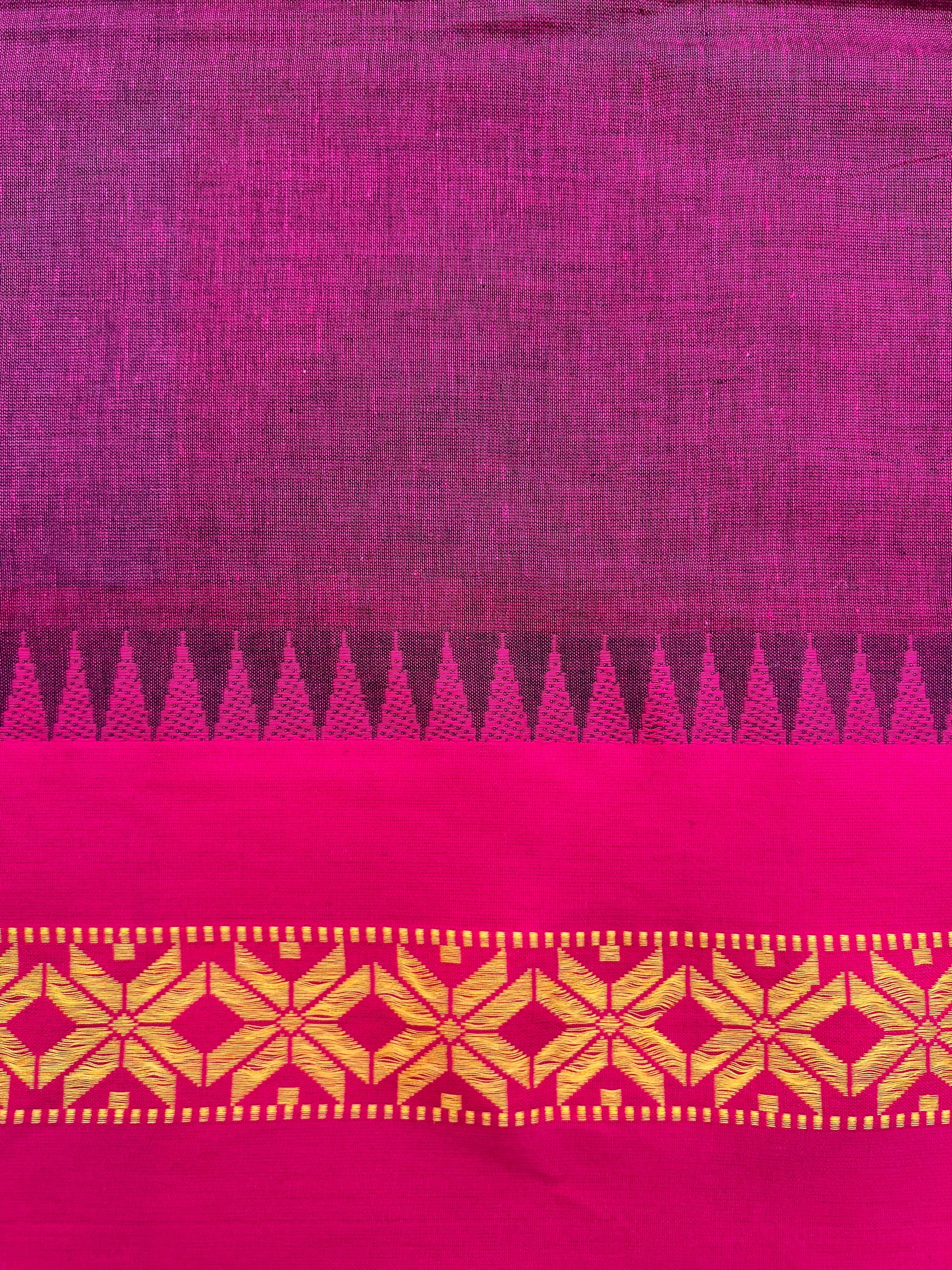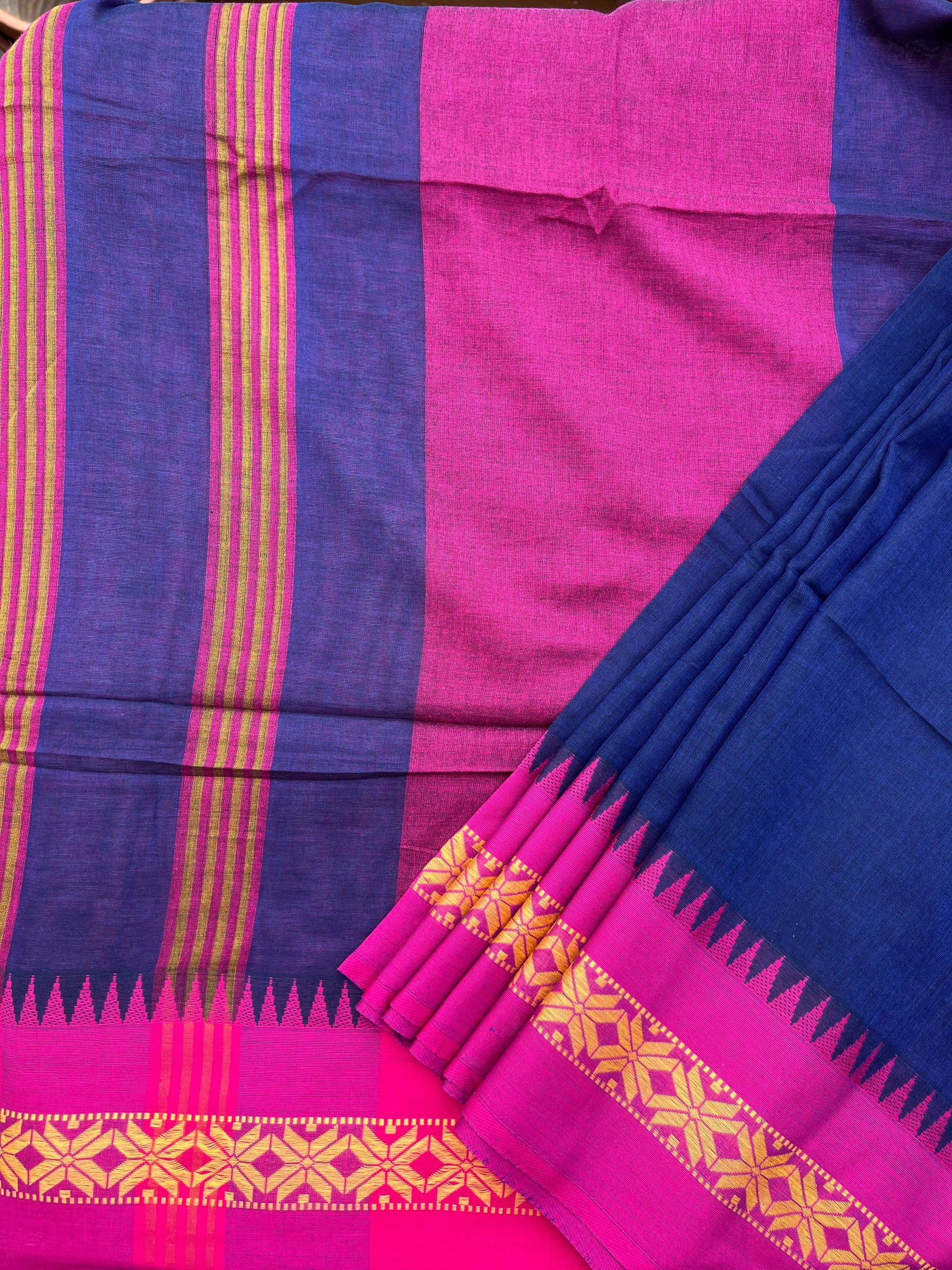 A very smart Bengal cotton saree featuring navy blue plain body and pink border, highlighted with traditional handwoven orange motifs — perfect for a bold yet elegant statement.